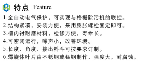 1、可直接装在拦渣捞渣或污泥脱水设备后,制造成密封结构,进行输送和压榨,起到汇集以及改善环境,渣物减量等作用,便于后续处理。