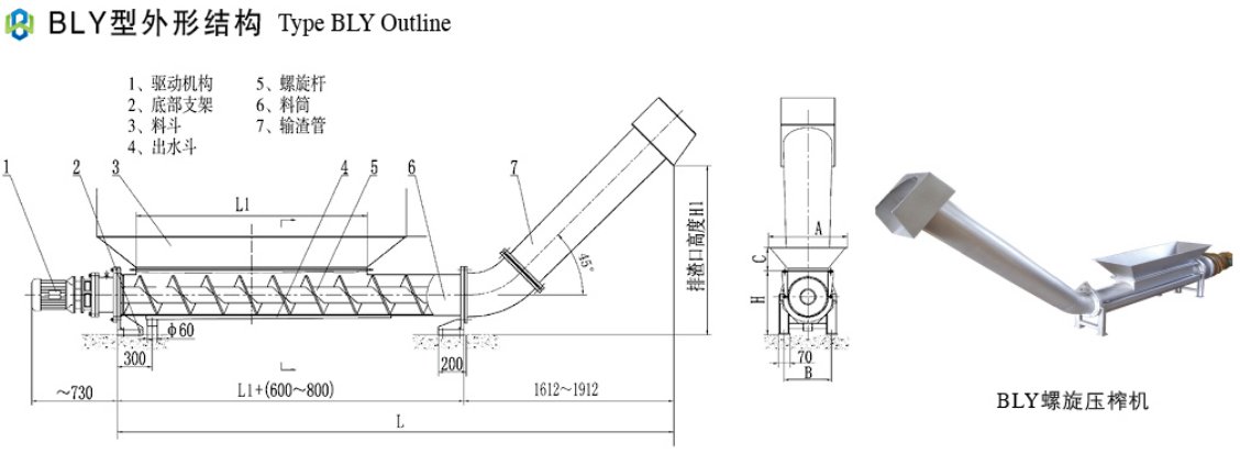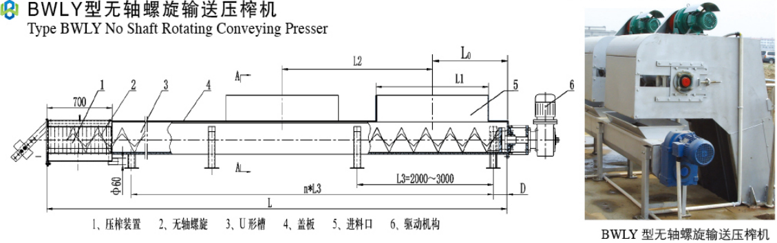 3、BYⅠ型转弯挤压式螺旋压榨机以压榨为主要功能具有一定的渣物输送提升功能,适用输送距离不,扬程不高的场合,一般为有轴结构; BYⅡ型重力板挤压式螺旋输送压榨机以输送功能为主,或具有输送和压榨一体化的功能,一般为无轴结构。