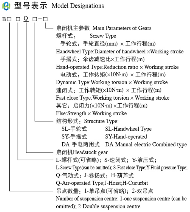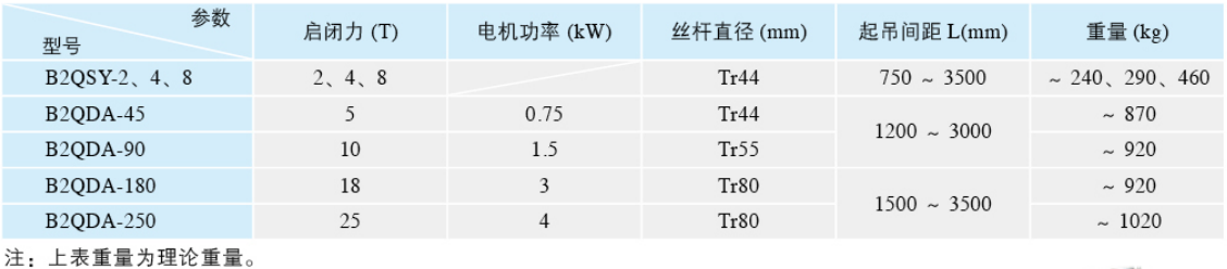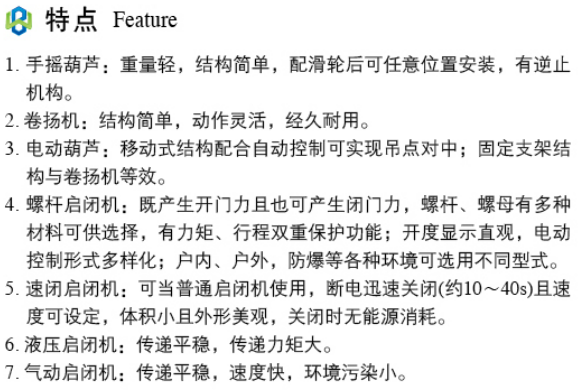 4、螺杆式启闭机:一般分为升杆式(即推力型)和暗杆(即回转式)两种;但按关闭速度可分为速闭启闭机和普通启闭机。普通型可适用于多数场合,速闭型一般作为事故性紧急关闭的工作场合;