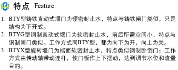 小型洞孔(B<2000)类,一般采用BTY型铸铁直动式堰门,其功能亦可实现完全关闭。