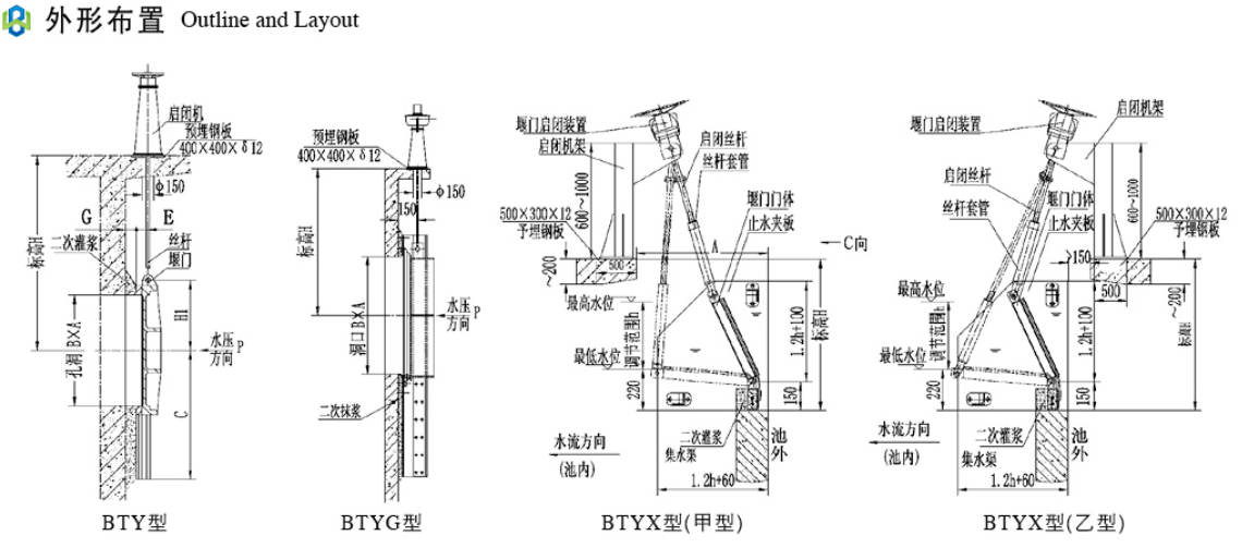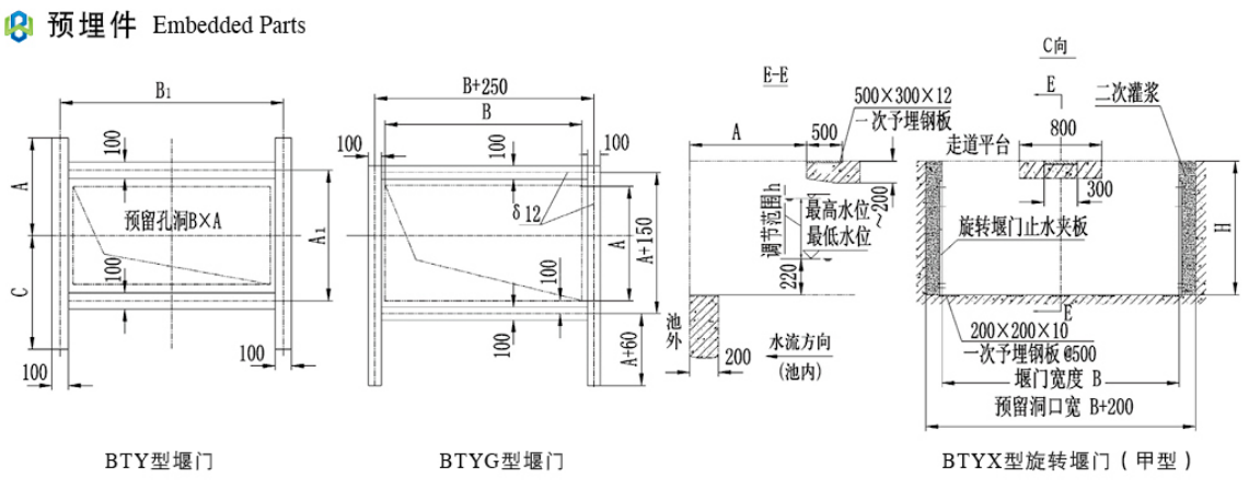 开口类(一般宽度大于2000,调节范围一般小于800,三边止水,且前后有操作空间的场合)宜选用BTYX型旋转堰门,其安装结构分池内、池外二种,由于启闭机的固定需采用较支式结构,故前后需一定操作空间。
