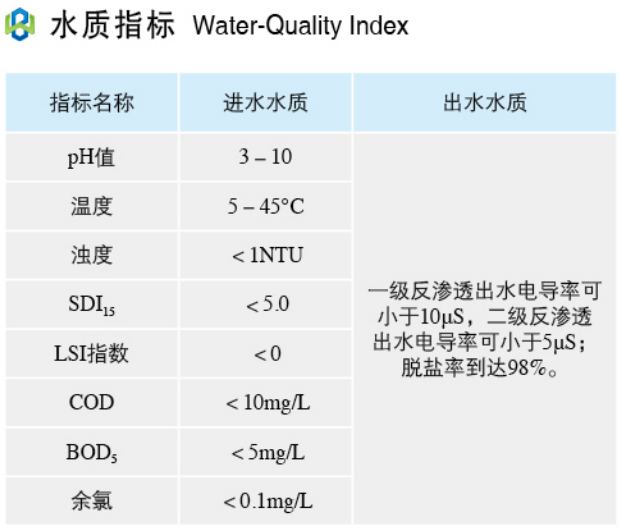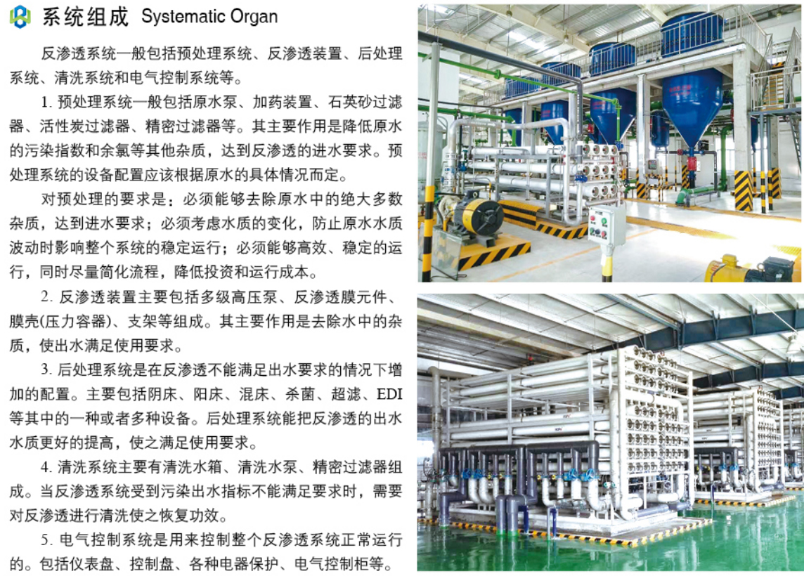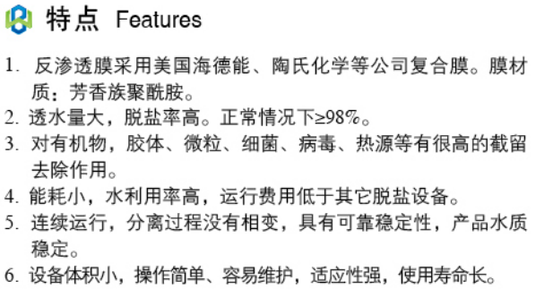 1、反渗透膜采用美国海德能、陶氏化学等公司复合膜。膜材质:芳香族聚酰胺。 2、透水量大,脱盐率高。正常情况下>98%。 3、对有机物,胶体、微粒、细菌、病毒、热源等有很高的截留去除作用。 4、能耗小,水利用率高,运行费用低于其它脱盐设备, 5、连续运行,分离过程没有相变,具有可靠稳定性,产品水质稳定。 6、设备体积小,操作简单、容易维护,适应性强,使用寿命长。