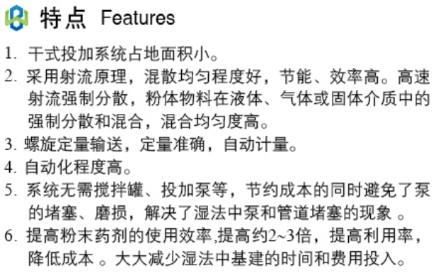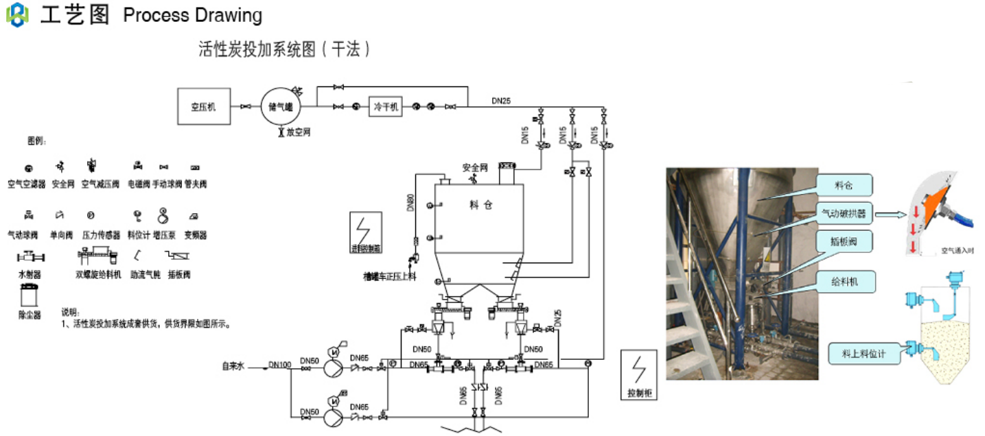 上料--储料--活性炭连续定量投加--由射流器投加至投加点(投加浓度一般不超过1%)。