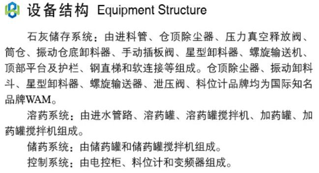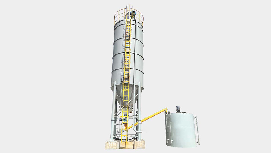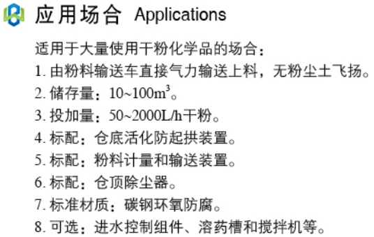适用于大量使用干粉化学品的场合: 1.由粉料输送车直接气力输送上料,无粉尘土飞扬。 2.储存量:10~100m3 3.投加量:50~2000L/h干粉。 4.标配:仓底活化防起拱装置。 5.标配:粉料计量和输送装置。 6.标配:仓顶除尘器。 7.标准材质:碳钢环氧防腐。 8.可选:进水控制组件、溶药槽和搅拌机等。