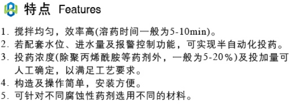 无溶液箱加药装置为现配现用形式,可用两台组合实现连续投药;针对不同投药量的大小其规格随之变化,可通过机座使加药装置与计量泵组成整体。