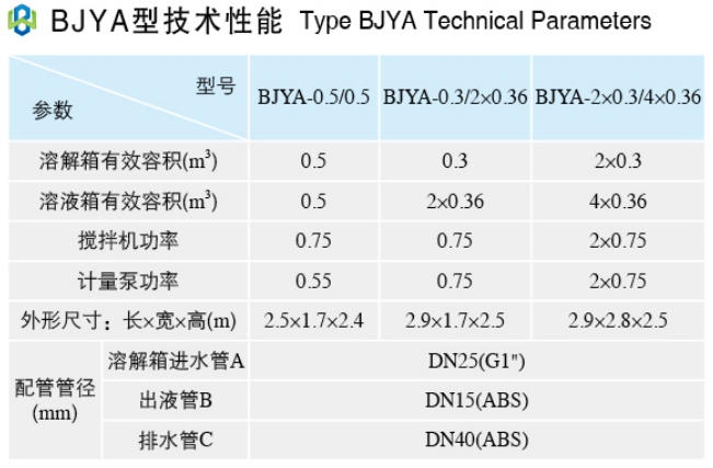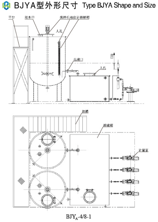 有溶液箱加药装置单台即可用于连续配制与投加。一般用于投药量相对较小场合,投药量较大时可设置多台对称布置。例:BJYA-2x0.3/4x0.36可认为是2台BJYA-0.3/2x0.36型共用爬梯组合而成,各个溶液箱可根据工艺要求贮放各自药液。