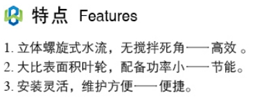 在渐开双弧面上均布有八条导流叶片,借助液体自重压力作补充进水获得的势能与叶轮旋转时产生的离心力形成动能,液体在重力加速度的条件下沿叶轮圆周方向作切线运动,在池壁的反射作用下,形成自下而上地循环水流,能有效地消除搅拌死角。