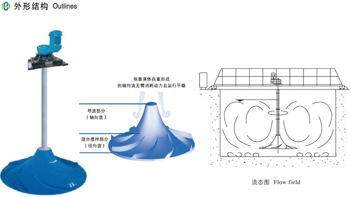 它广泛运用在环保、化工、能源、轻工等行业需要对液体进行固、液、气搅拌混合的场合,尤其适用在污水处理工艺中的混凝池、调节池、厌氧池、硝化和反硝化池。