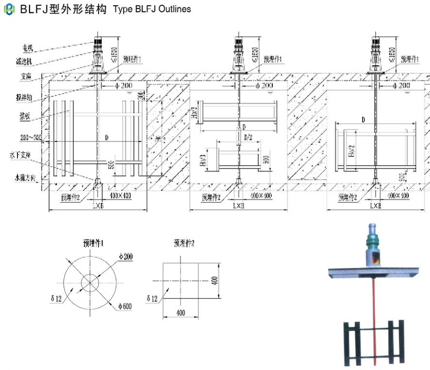 用于给排水工艺混凝过程的絮凝阶段,使胶体颗粒絮凝形成较大的颗粒,以利于沉淀。 立式和卧式搅拌机均可采用多档转速,使絮凝过程中各段具有所需要的搅拌强度,以适应水质水量的变化。卧式搅拌机适用于水平穿壁安装。