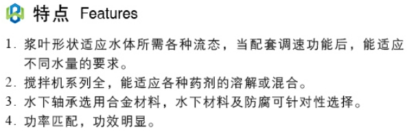主要用于大、中型水厂或污水处理厂中混凝剂等药剂的溶解稀释,以及在池内或容器内不同比重的有机或无机液体的液相搅拌混合。 平叶浆水流特性为径向流,一般适用于普通溶液混合,通常池内设置挡流板、折流板,且池深不深的场合。 折板浆既具有径向流,也有环向流特性,一般用于水深较深的场合,通常也要求设置挡流板。 螺旋浆水流特性为轴流型,适用池深很深的场合,一般配置导流筒,大多数用于污泥消化池作搅拌及升流用。