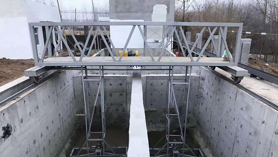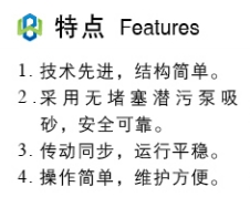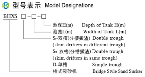 桥式吸砂机主要用于污水处理厂(站)的平流式曝气沉砂池,提取沉砂池底部的沉砂。吸砂机在钢轨上沿沉砂池长度方向来回运动,机上的吸砂泵(潜污泵)将池底的砂水混合物吸出排至水沟,或提升至一定的高度,进入配套设备(砂水分离器)进行分离,与旋流沉砂器功能主要区别在于机上可设撇渣板将水面上的浮渣刮至池末端的渣槽中。若只需撇渣功能则与BHSD型刮沫机功能相似。