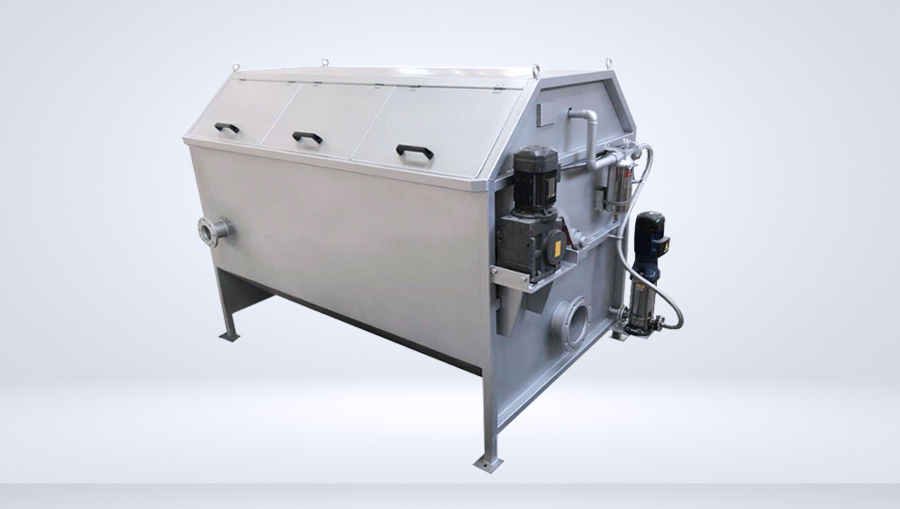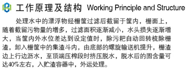 处理水中的漂浮物经栅筐过滤后截留于筐内,栅面上,随着截留污物量的增多,过滤面积逐渐减小,水头损失逐渐增大,当筐内外水位差达到设定值时,除污耙自动回转梳除栅渣,卸入栅筐中的集渣斗内,由底部的螺旋输送机提升,栅渣边上行边沥水,至顶端压榨段时挤压脱水,脱水后的固含量可达40%左右,入贮渣容器中,外运处理。
