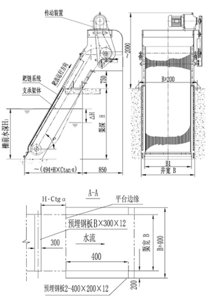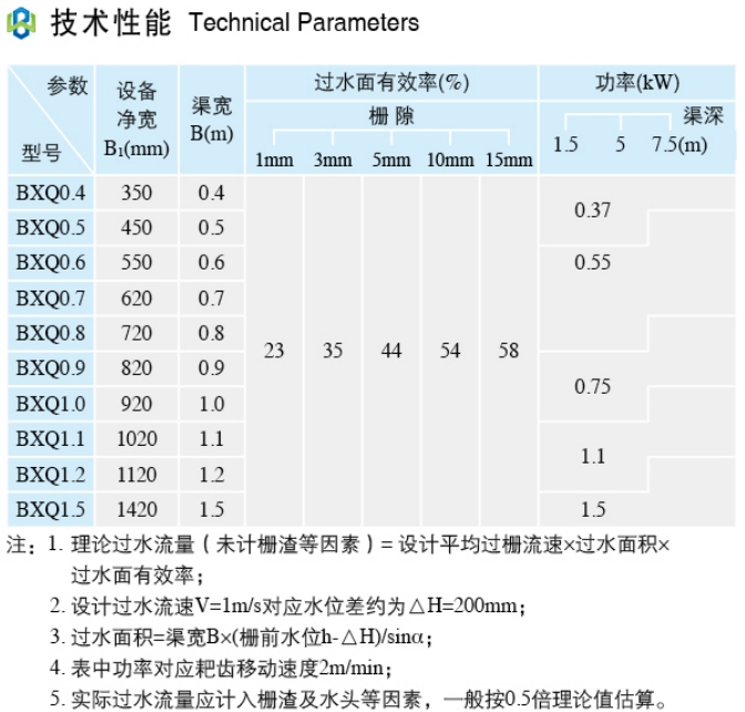 一般用作为污水预处理的第二道(或第二道以后)格栅,作细格栅用,小规格最小间隙可达1mm。当单台宽度较大(B>1550mm)时,应考虑制作成并联机(即一个驱动装置驱动多组栅面 )