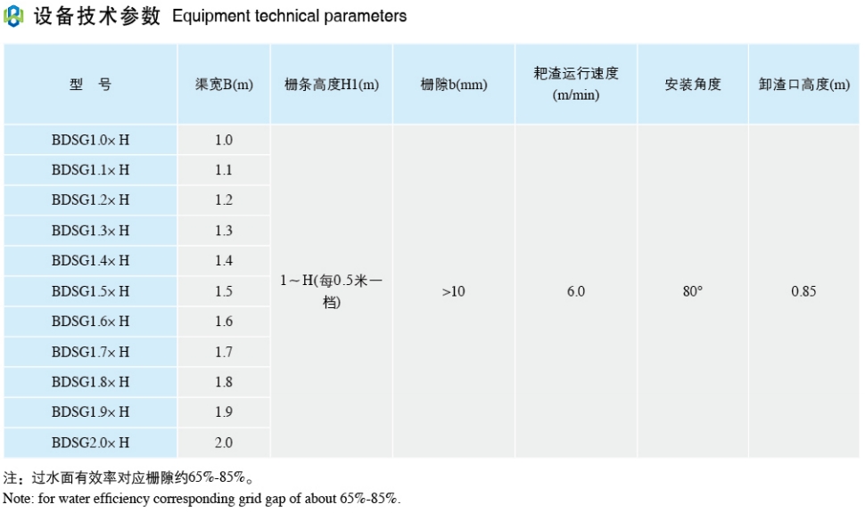 BDSG型动轨式格栅除污机一般用于深度较深、宽度不大于2m的渠道内,属于中粗格栅机,栅条间隙一般为>10mm。