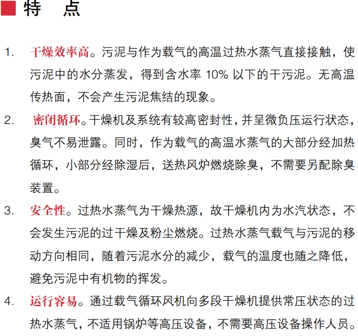 多段床流动干燥机为长方柱体,内部有多段楼板;楼板上配有缓慢旋转的多个搅拌叶。搅拌叶的相互运动配合使脱水污泥一边被翻动,一边水平移动。脱水污泥与由高温水蒸气组成的载气接触,在至上而下的第一段楼板,第二段楼板,第三段楼板及地板上的移动过程中,污泥为高温水蒸气加热,污泥中的水分被蒸发,达到干燥效果后,干污泥从多段干燥机底部排出。